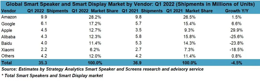 Strategy Analytics:2022 Q1 全球智能音箱出货量同比下降 5%