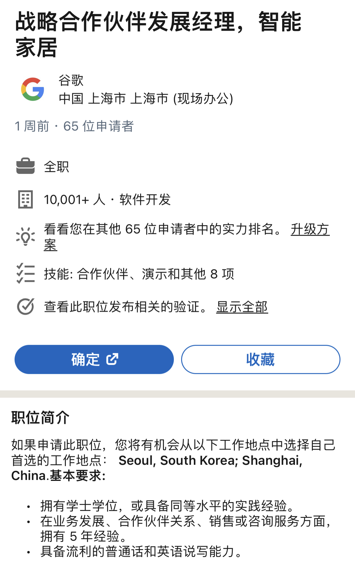 近来,动点科技经过领英了解到,一周前,谷歌在我国开放了其智能家居战略协作伙伴展开司理的职位,工作地坐落上海(也可选择韩国首尔)。现在,该岗位已经有65位申请者。